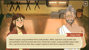 Kristina, seseorang yang lelah dengan kehidupan kota, kembali ke kampung halamannya dan menemukan warisan yang nyaris terlupakan—Keris. Melalui bimbingan ayahnya yang seorang Empu, ia belajar bahwa Keris adalah karya seni yang lahir dari dedikasi dan sejarah panjang budaya Nusantara. Dalam perjalanan ini, pemain akan menempuh proses tempa, memahami filosofi, dan membantu Kristina menemukan kembali jati dirinya serta warisan yang ingin ia jaga.