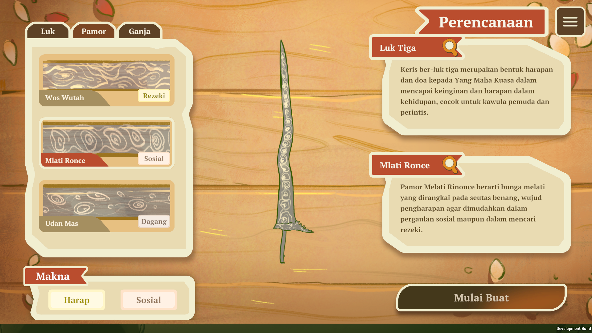 Keris, warisan budaya takbenda Indonesia yang diakui UNESCO sejak 2005, kini menghadapi ancaman kepunahan. Jumlah empu pembuat keris terus menurun karena kurangnya regenerasi dan minimnya minat generasi muda. Stigma mistis yang melekat juga membuat masyarakat enggan mendekatinya. Kurangnya pemaparan dan pelestarian pengetahuan inilah yang mendorong kami mengangkat tema keris dalam proposal Budaya GO, sebagai upaya menghidupkan kembali minat terhadap warisan ini melalui media digital interaktif.